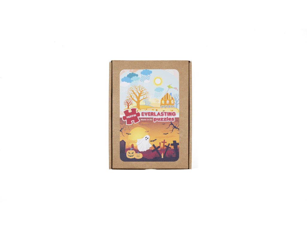 JESIEŃ - Zestaw składa się z 12 dwustronnych puzzli, które idealnie do siebie pasują, tworząc piękny obrazek jesiennego krajobrazu pełnego kolorowych liści z jednej strony i tajemniczej atmosfery Halloween z drugiej.