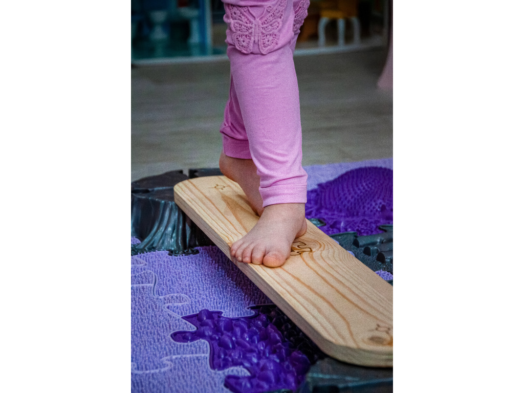 • Promowanie rozwoju fizycznego – na kładce MUFFIK dzieci ćwiczą stawianie stóp przed sobą, koordynację wzrokowo-ruchową i koncentrację. Balansowanie na równoważni wzmacnia tułów i mięśnie kończyn dolnych.